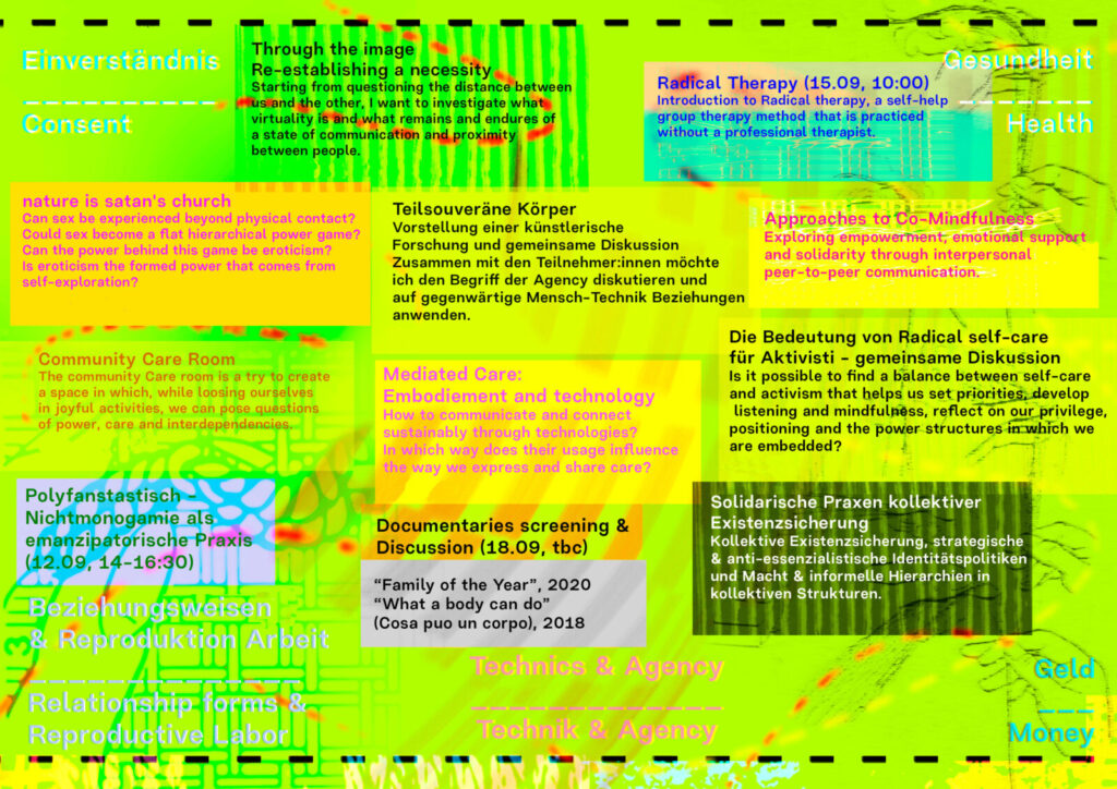 Stemmed out of ongoing conversations and personal thoughts shared since the spring of 2020, Cheerful Weaves – Labor für gelungene Abhängigkeiten (Laboratory for Joyful Dependencies) framed a self-organised process to reflect and experiment with collective practices of care. In the midst of the pandemic’s unfolding, intimate exchanges between friends waked a joyful militant wish to explore and acknowledge what mutual responsibilities and needs we share in caring for, with, of, and about each other, while holding together in a critical stance towards structures of power and dominance overarching society.